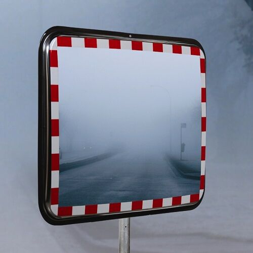 De spiegel is voorzien van een opvallende rood/wit reflecterende rand.
