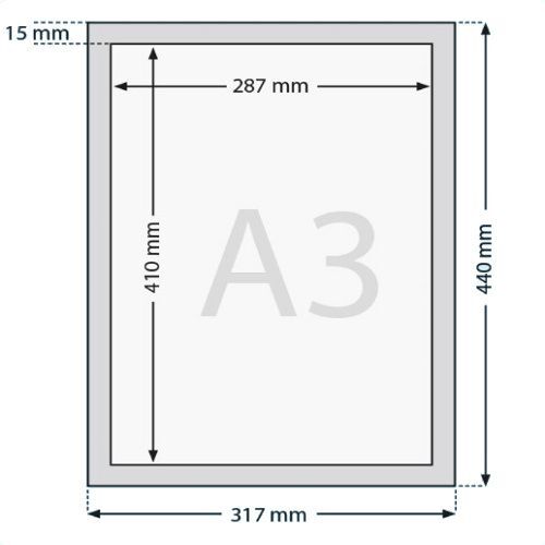 | Afmetingen – buitenmaat/binnenmaat | A3 440 x 317 mm / 410 x 287 mm |